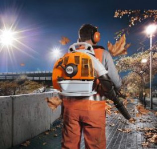 High-performance blower for easily removing grass and hedge cuttings, leaves and debris from large areas. Rubberised 2-component handle, STIHL anti-vibration system, wide shoulder straps, STIHL ElastoStart, 2-MIX engine, simple starting logic, locking throttle lever with stop button, carry handle.